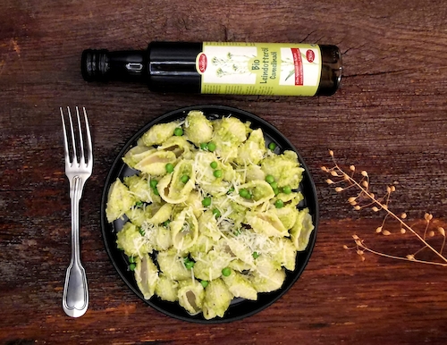 Was liegt näher, als für ein Pesto den erbsigen Geschmack des Leindotteröls mit dem von Erbsen zu kombinieren? Heraus kommt ein Pesto, das grün, frisch und aromatisch schmeckt. Ein Hochgenuss für alle Sinne!